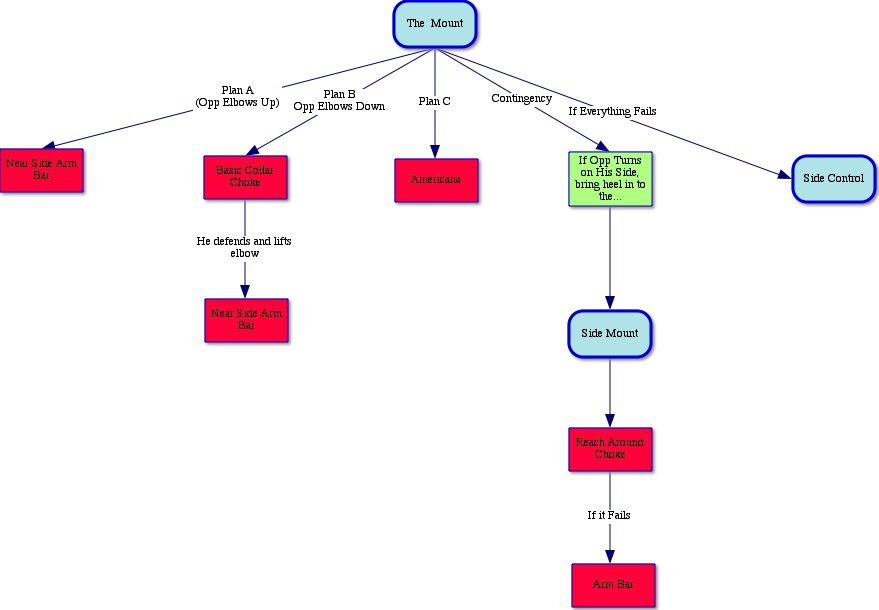 As you learn more techniques, you will add them to your game plan. You can create flowcharts to help you remember your game plan. At TNBJJ, I have created flowcharts for the entire white to blue belt curriculum to aid you in your development. All of these are available to my students on the website (password is required) An example is shown below for 3 stripe white belt, Mount Top: